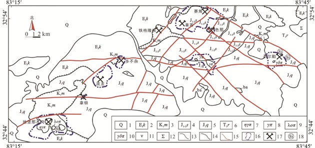 矿集区内出露地层主要可见有上三叠统日干配错组、下侏罗统曲色组 (J1q)、中-下侏罗统色哇组 (J1-2s)、下白垩统美日切错组 (K1m),另可见大面积分布的第四系 (Q)。其中下侏罗统曲色组及中-下侏罗统色哇组是矿集区内重要的赋矿围岩地层。矿集区内主要发育一套中酸性侵入岩,岩性主要可见花岗闪长斑岩、石英闪长玢岩、花岗斑岩、闪长玢岩、闪长岩等,其中以岩株或岩脉形式产出的花岗闪长斑岩、石英闪长玢岩为矿集区内重要的成矿斑岩。矿集区内构造主要可见断裂构造,可见有EW向、NE向、NW向断裂构造发育,其中地堡那木岗、波龙、多不杂、铁格隆南及拿若等矿床均沿北东向断裂构造分布,而尕尔勤、色那、赛角及拿若则沿北西向断裂构造分布。