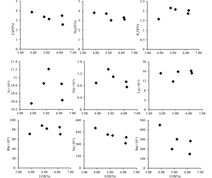 岩石中如存在H2O、CO2等挥发份会致使其在烧灼时逃逸形成烧失量 (LOI),其中CO2常以碳酸盐矿物的形式出现,H2O则多与含水矿物有关。蚀变是斑岩型矿床的必备条件,其发育的绢英岩化及青磐岩化蚀变带中均具有大量含水矿物及一定的碳酸盐矿物,因此斑岩型矿床成矿斑岩在分析过程中往往会出现相对较高的烧失量。本次用于测试样品均选择蚀变相对较弱的进行,但烧失量依然较高。从Harker图解及岩石分析数据表中可以看出 (图 10、表 3),LOI与CaO的含量呈负相关关系,表明岩石烧失量主要是与含水蚀变矿物有关;LOI与Na2O及Sr的含量呈微弱的负相关关系,而与K2O的含量则成微弱的正相关关系,表明岩石具有一定程度的钾化及绢英岩化,从而造成K的相对升高而Na、Sr的相对降低,但相关性并不明显,表明蚀变程度并不高;LOI与Y、Yb、La等稀土元素,Rb、Ba等多数大离子亲石元素元素以及高场强元素并无明显的相关性 (图 10、表 3),表明稀土元素及大部分微量元素可信度均较高。