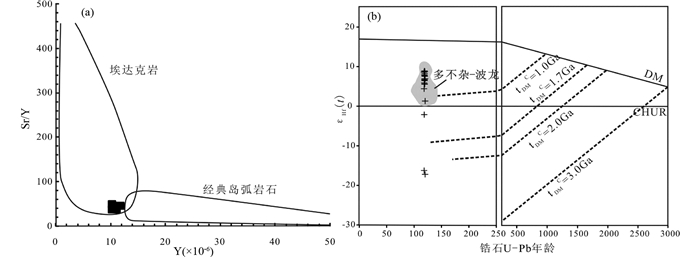 图 11 尕尔勤矿区斑岩体Sr/Y-Y图解 (a, 据Defant and Drummond, 1990) 和锆石U-Pb年龄-εHf(t) 图解 (b) 多不杂数据据李金祥, 2008; 波龙数据据陈华安等, 2013; Li et al., 2013 Fig. 11 Sr/Y vs. Y plot (a, base map after Defant and Drummond, 1990) and U-Pb ages vs. εHf(t) diagram (b) of porphyry in Gaerqin deposit |