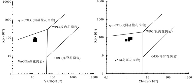图 12 尕尔勤矿区斑岩体Rb-Y+Nb (a) 和Rb-Yb+Ta (b) 图解 (底图据Pearce et al., 1984) Fig. 12 Rb vs. Y+Nb (a) and Rb vs. Yb+Ta (b) diagrams of porphyry in Gaerqin deposit (base map after Pearce et al., 1984) |