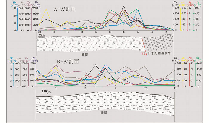 前述研究已表明,角砾状硅帽样品强烈富集Cu、Pb、Zn、Sb、Y、As、Ga等亲铜元素,表明其具有一定的勘查指示意义。本次研究对识别出的硅帽地区进行了十字地化剖面测量 (图 13),结果显示异常较为明显。在A-A’剖面中,Cu、Au、Ag、Pb、Zn、As、Sb、Hg等成矿指示性元素总体含量值总体均较大,而且高值异常区非常明显,且异常叠合完好,其中Cu、Au、Ag、Pb、Zn中心异常基本完全套合,而As、Sb、Hg异常则紧靠前述元素外围。A-A’剖面异常位置靠近矿区F2断层,暗示该异常可能与该断裂活动有关。在B-B’剖面中,Cu、Au、Ag、Pb、Zn、As、Sb、Hg等成矿指示性元素都具有高含量特征,但无明显高值异常区域,与A-A’剖面中西段类似,表明尽管该区域成矿指示性元素具有一定程度的富集,但在靠近F2断层的硅帽区域富集程度更强,是探矿工程布设的首选位置。