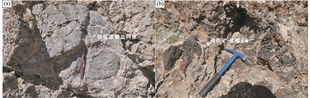 本次高光谱测试识别出了埃洛石、伊利石、高岭石、方解石等泥化带矿物,前述矿物与强硅化组成了顶部高级泥化带,结合前述地化剖面的异常特征显示其具有存在浅成低温热液或斑岩-浅成低温热矿床的巨大可能性。目前并未识别出明矾石、绢云母、冰长石等更具有进一步指示意义的标志性矿物,是否属于高硫或低硫型还需要进一步工作去判别,但总体表明硅帽区域具有重要的勘查意义。值得注意的是,在与强烈富集成矿指示元素的硅帽邻近的日干配错组灰岩中发现了大量的由铁锰碳酸盐矿物组成的网脉 (图 14a),经后期氧化形成团块状褐铁矿、软锰矿等矿物 (图 14b),表明该区域流体活动强烈,属于典型的流体逃逸现象,这也是硅帽区域值得进一步进行勘查工作的侧面证明。