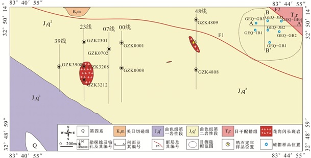 尕尔勤斑岩铜矿床位于多龙矿集区东南部 (图 1),是矿集区内最具找矿潜力的矿床之一。前人已陆续进行了一些探矿工作,但未能取得大的突破。矿区内出露地层主要可见第四系 (Q)、下白垩统美日切组错下段 (K1m)、下侏罗统曲色组第一、二岩性段 (J1q1、J1q2) 以及上三叠统日干配错组 (T3r)(图 2)。曲色组第一岩性段主要由浅灰白色、浅黄褐色薄至中厚层状弱褐铁矿化、弱硅化长石石英砂岩组成,该套地层在矿区南西部大量出露;曲色组第二岩性段主要由浅灰色、浅黄褐色薄至中厚层状弱褐铁矿化、弱硅化长石石英砂岩组成,曲色组第二岩性段与下覆第一岩性地层呈整合接触关系。下白垩统美日切错组主要可见一套紫红色安山质火山碎屑岩、安山玢岩,主要分布在矿区的北部,分布范围较窄。上三叠统日干配错组展布于矿区北东部,范围较小,岩性为一套单一的灰黑色结晶灰岩,与曲色组第二岩性段呈断层接触关系。