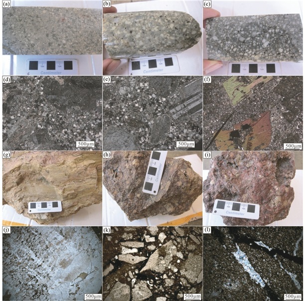 图 3 尕尔勤矿区斑岩体及硅帽照片 (a-c) 绢英岩化及钾化花岗闪长斑岩;(d-f) 为 (a-c) 对应的镜下照片;(g) 层纹状 (致密块状) 硅帽;(h、i) 角砾状硅帽,可见明显充填交代现象;(j) 为 (g) 的对应镜下照片;(k、l) 为 (h、i) 对应镜下照片 Fig. 3 Photos of porphyry and lithoscapss in Gaerqin deposit |