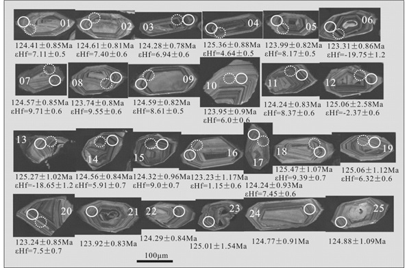 图 4 尕尔勤矿区斑岩体锆石阴极发光图像及锆石U-Pb定年 (实线圈) 和Hf同位素 (虚线圈) 测点位置 Fig. 4 Zircon cathodoluminescence (CL) images and analysis spots of U-Pb (real coil) and Hf isotope (virtual coil) from porphyry of Gaerqin deposit |