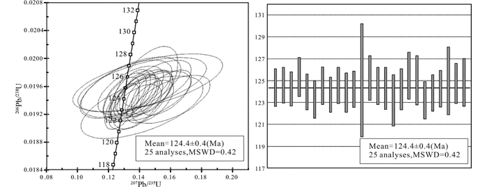 本次对花岗闪长岩样品挑选出的锆石晶体共进行了25个点的测试,锆石U-Pb同位素分析结果见表 1。样品中Th含量在69×10-6~270×10-6之间,平均值为148.3×10-6,U含量在289×10-6~784×10-6之间,平均值为477.7×10-6,Th/U比值在0.20~0.40之间,具岩浆成因锆石特征。样品测点年龄的计算是利用Isoplot软件进行处理,得到的锆石206Pb/238U加权平均年龄为124.4±0.4Ma (MSWD=0.42,n=25),该年龄代表了花岗闪长岩的结晶年龄,属于早白垩世侵位。在206Pb/238U-207Pb/235U谐和图上可以看出 (图 5),所有分析数据点均分布在谐和曲线上,拟合度较高,得到的年龄值真实可靠。
