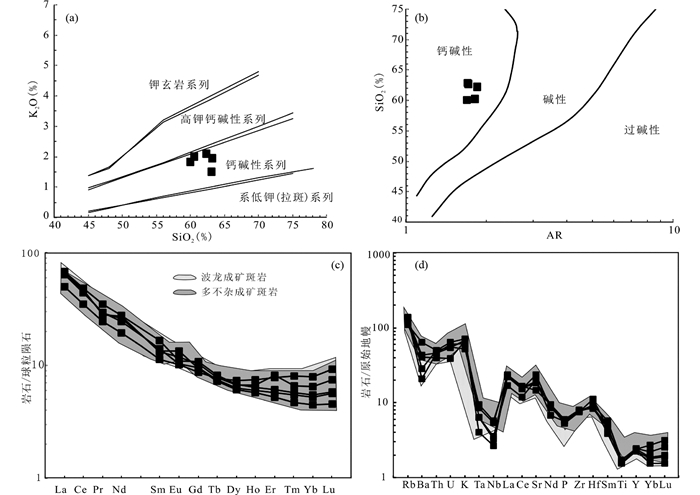 图 6 尕尔勤矿区斑岩体SiO2-K2O图解 (a, 据Peccerillo and Taylor, 1976)、SiO2-AR图解 (b, 底图据Wright, 1969)、球粒陨石标准化稀土元素配分图 (c, 标准化值据Boynton, 1984) 及原始地幔标准化微量元素蛛网图 (d, 标准化值据Sun and McDonough, 1989) 多不杂成矿斑岩数据据李金祥, 2008;波龙成矿斑岩数据据Li et al., 2013; 陈华安等, 2013 Fig. 6 SiO2-K2O plot (a, map after Peccerillo and Taylor, 1976), SiO2-AR plot (b, base map after wright, 1969), chondrite-normalized REE patterns (c, normalization values after Boynton, 1984) and primitive mantle-normalized trace element spidergrams (d, normalization values after Sun and McDonough, 1989) of porphyry in Gaerqin deposit |