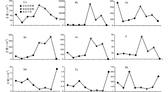 矿区硅帽样品总体表现出微量元素低的特点,相对于地壳元素丰度而言 (表 3),Nb、Ta、Th、Ba等不相容元素亏损较为明显,而Cu、Pb、Zn、Sb、Y、As等亲铜元素则表现为富集特征,含量均在克拉克值的1.5倍以上,特别是角砾岩型硅帽中Cu、Zn、As、Sb等元素表现为强烈富集 (图 8)。此外Ni、Co、Rb、V、Ba等也表现为亏损特征。