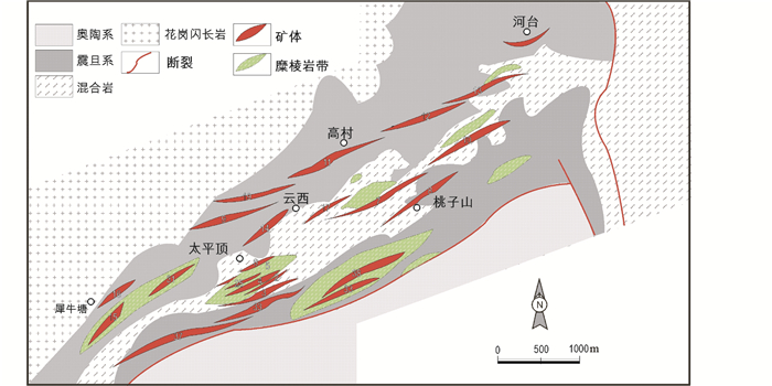 区域内矿产资源丰富,主要矿种包括硫铁矿、铁、铅锌、银、钨、锡、铜、钼和金等。代表性矿床包括震旦系地层控矿的云浮硫铁矿床,泥盆系地层控矿的盘龙铅锌矿,韧性剪切带控矿的河台金矿和燕山期花岗岩控矿的圆珠顶铜钼矿床等 (图 1b)。