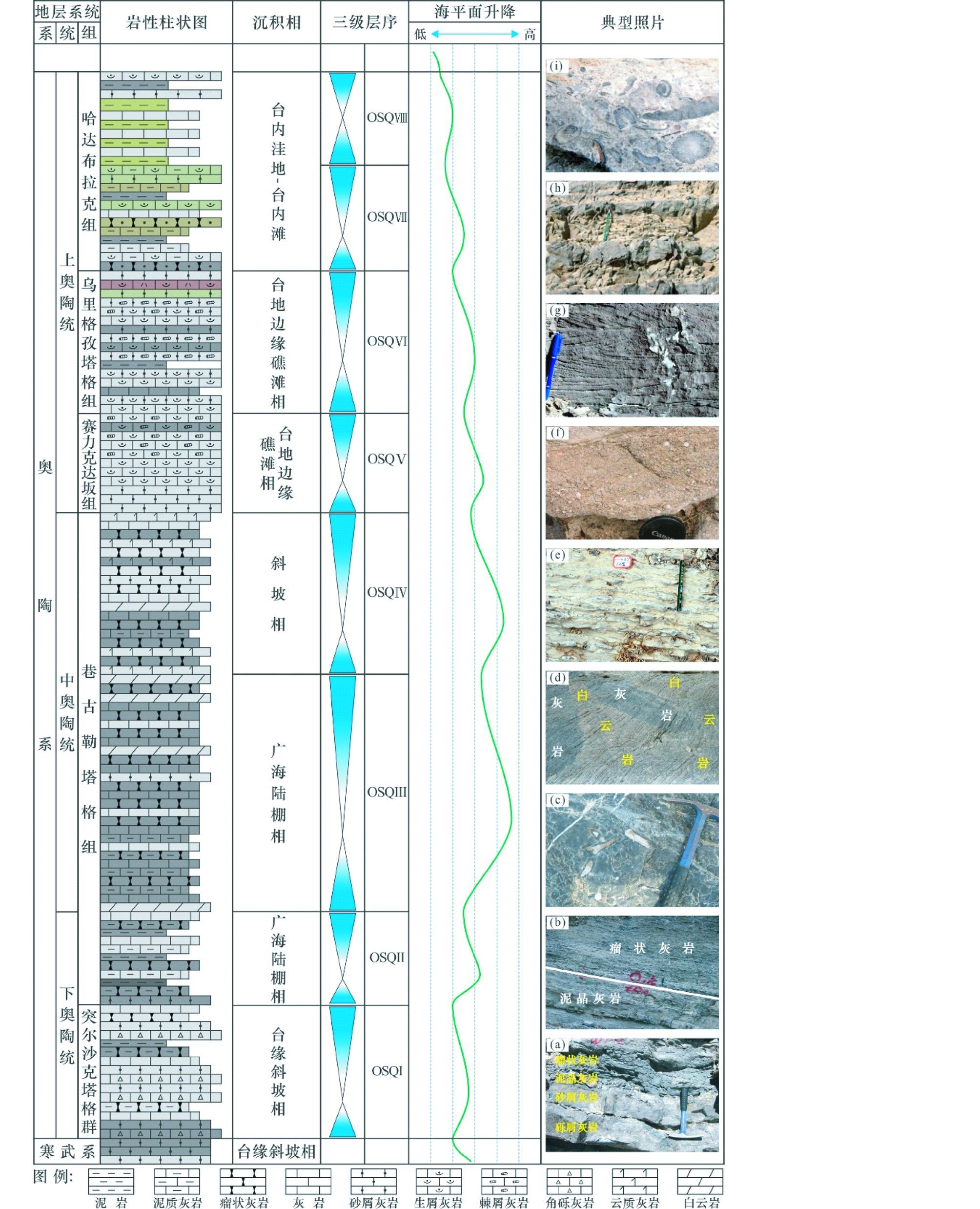 中下奥陶统巷古勒塔格组进一步划分为上、中、下三段,下段 (厚273.5m),岩性为瘤状灰岩夹钙质泥岩、泥晶灰岩 (图 4b);中段 (厚728.2m),岩性为深灰色泥晶灰岩、泥质条纹泥晶灰岩与瘤状灰岩不等厚互层,顶部发育巨斑状白云岩 (图 4d, e);上段 (厚534.2m),岩性为深灰色瘤状泥晶灰岩与 (含泥质纹层) 泥晶灰岩互层,局部发生白云岩化。巷古勒塔格组中、下段整体发育大量的瘤状灰岩 (图 4b),以及泥质灰岩,表明沉积水体较深,碳酸钙周期性的中断,水平层理,波状层理及生物钻孔发育 (图 4c),为广海陆棚相沉积环境;向上段瘤状灰岩减少,泥质含量降低,开始出现少量砂屑灰岩,反应水体逐渐变浅,但整体整体沉积能量仍较低,为缓斜坡相沉积环境 (图 4、图 5)。