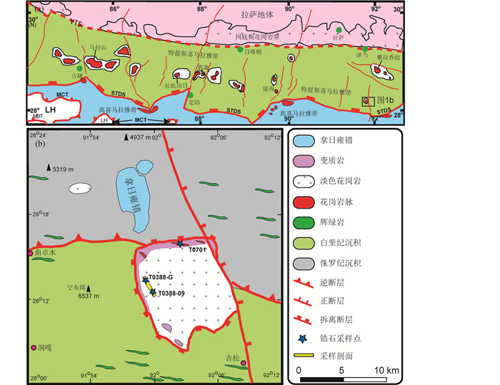 地壳深熔作用是造山带构造演化的重要深部过程,是高级变质作用、岩浆作用与构造变形之间高度耦合的重要体现(曾令森等, 2008),可以通过厘定地壳物质部分熔融体的形成年代和形成机制来限定造山带的构造演化过程(Aoya et al., 2005; Lee and Whitehouse, 2007; Hou et al., 2012; Wang et al., 2017)。喜马拉雅造山带是世界上碰撞造山带的典例,是研究大陆地壳中低温部分熔融作用的重要野外实验室(Gao et al., 2017)。虽然喜马拉雅淡色花岗岩的研究程度越来越高,但由于分布区域非常广阔,还存在大量的空白区,为了完善喜马拉雅造山带新生代深熔作用体系,还需要对空白区的淡色花岗岩进行系统研究,识别地壳深熔作用新类型和岩浆作用过程。最近我们在雅拉香波穹窿南部,错那北部厘定出一个新穹窿——拿日雍错穹窿(图 1a)。为确定该穹隆核部淡色花岗岩的源岩,探讨淡色花岗岩的形成机制及构造动力学意义。我们进行了系统采样,进行了锆石U-Pb定年,测试了全岩元素和Sr-Nd同位素组成。为喜马拉雅新生代淡色花岗岩补充了新的数据,有助于进一步检验和完善喜马拉雅造山带深熔作用和岩浆作用模型。