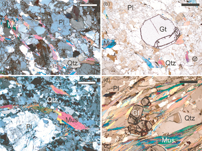 图 2 淡色花岗岩T0388-1 (a、b)、T0388-4 (c)和T0388-9 (d)的显微照片 图中标尺长度为500μm.矿物代号:Gt-石榴石;Mus-白云母;Pl-斜长石;Qtz-石英 Fig. 2 Photomicrographs showing the texture and mineral assemblage of leucogranites T0388-1 (a, b), T0388-4 (c) and T0388-9 (d) The scale bars in all photomicrographs are 500μm. Gt-garnet; Mus-muscovite; Pl-plagioclase; Qtz-quartz |