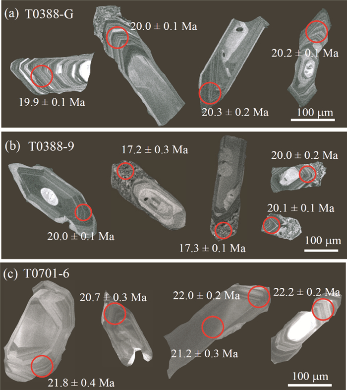 图 3 淡色花岗岩T0388-G (a)、T0388-9 (b)和T0701-6 (c)中锆石的阴极发光照片 Fig. 3 Cathodoluminescence (CL) showing the texture, spot, and respective age of zircon U/Pb dating for the leuocogranite T0388-G (a), T0388-9 (b) and T0701-6 (c) |
