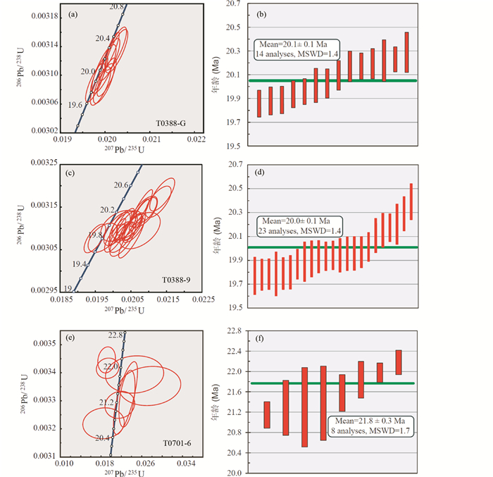 图 4 淡色花岗岩T0388-G (a、b)、T0388-9 (c、d)和T0701-6 (e、f)中锆石的U/Pb定年谐和图 Fig. 4 U/Pb concordia diagram for the leuocogranite T0388-G (a, b), T0388-9 (c, d) and T0701-6 (e, f) |