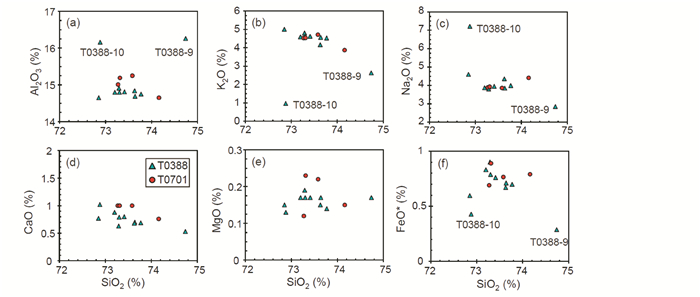 图 5 淡色花岗岩T0388和T0701系列的Al2O3(a)、K2O (b)、Na2O (c)、CaO (d)、MgO*(e)和FeO*(f)与SiO2的关系图解 Fig. 5 Selected major oxides of Al2O3(a), K2O (b), Na2O (c), CaO (d), MgO*(e) and FeO*(f) plotted against SiO2 for the leucogranite T0388 and T0701 series |