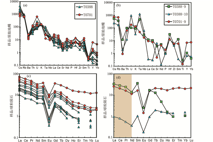 与微量元素特征相似,除T0388-9、T0388-10和T0701-9外,其它样品显示了一致的稀土元素特征(图 6c)。在球粒陨石标准化稀土元素配分图上,这些样品显示富集轻稀土(LREE)和中稀土(MREE),亏损重稀土(HREE),(La/Yb)N>16.3(除T0701-10外,(La/Yb)N=5.96),显著的Eu负异常(Eu/Eu*=0.11~0.65),微弱的Nd负异常(Nd/Nd*=NdN/(PrN2×SmN)1/3=0.74~0.81)。其它3个样品具有轻稀土(La、Ce、Pr和Nd)亏损,重稀土平直或亏损,更加显著的负Eu异常的特征(Eu/Eu*=0.10~0.18,图 6d)。与Eu异常相似,这3个样品具有显著的Nd负异常,Nd/Nd*=0.50~0.70。