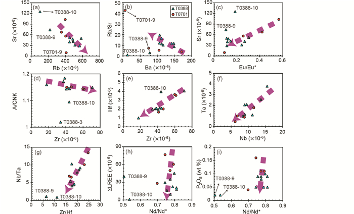 除T0388-9、T0388-10和T0701-9外,其它样品显示了一致的微量元素特征(图 6)。从微量元素原始地幔标准化蜘蛛网图上看,Ba和Ti为显著的负异常,Nb、Ta、Sr和P为弱负异常(图 6a)。T0388-9、T0388-10和T0701-9显示了复杂的蜘蛛网图,如T0388-10具有K和轻稀土元素(La、Ce、Nd)的负异常,Ta的正异常;T0388-9具有Ta的正异常;T0701-9具有更加显著的Ba和Sr负异常(图 6b)。与其它大多数样品相比(Rb=353×10-6~583×10-6,Sr=31×10-6~67×10-6,Rb/Sr=3.9~19.4),T0388-9和T0388-10具有较低的Rb(<219×10-6)和Rb/Sr(<3.0),较高的Sr(>74),T0701-9具有最低的Sr,最高的Rb/Sr比值,即Sr=9.6×10-6,Rb/Sr=42.6(图 7a, b)。在T0388-9和T0388-10中,Nb(>19.3×10-6)和Ta(Ta>17.4×10-6)含量较高,Nb/Ta比值较低(<1.1),其它样品中,Nb<15.5×10-6、Ta<3.8×10-6、Nb/Ta>4.1(图 7f, g)。同时,T0388-9和T0388-10具有较高的Hf(>4.0×10-6)和较低的Zr/Hf比值(<11.1),其它大多数样品中,Hf<3.6×10-6,Zr/Hf=16.4~28.4(除T0388-4,Hf=4.1×10-6,图 7e, g)。