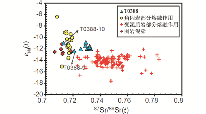 为探讨拿日雍错穹窿内淡色花岗岩的源岩,对10件T0388系列中的淡色花岗岩进行了Sr和Nd同位素分析。分析结果列在表 3中,Sr-Nd的同位素系统关系显示在图 8中,图中投影点的大小要大于分析误差。Sr同位素比值变化范围较大,Nd同位素比值较一致。样品T0388-9和T0388-10的Sr同位素比值(87Sr/86Sr(t)=0.7132~0.7210) 较低,其它7件样品的Sr同位素组成(87Sr/86Sr(t)=0.7257~0.7330) 都大于0.7257,但Nd同位素比值没有显著差异,εNd(t)在-12.4和-10.9之间变化。