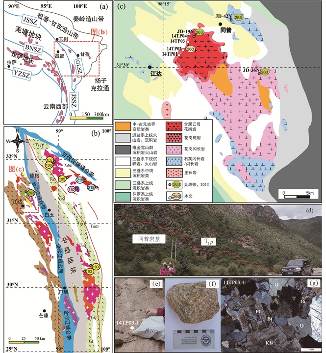 图 1 研究区地质简图和样品野外照片 (a)青藏高原-三江地区构造单元划分(据Zhu et al., 2013;Deng et al., 2014a, b);(b)三江地区地质简图(据Deng et al., 2014a, b;谢尧武等,2007①改绘);(c)同普岩基地质简图(据吴涛等,2013;谢尧武等,2007);(d)同普岩基和下三叠统普水桥组接触界面;(e)样品14TP03-1野外露头照片;(f)样品14TP03-1照片;(g)样品14TP03-1显微照片 Fig. 1 Simplified geological map of the studied area and petrographical photos of samples (a) tectonic subdivision of the Tibetan Plateau-Sanjiang Region (modified after Zhu et al., 2013; Deng et al., 2014a, b); (b) simplified geological map of Sanjiang area (modified after Deng et al., 2014a, b); (c) simplified geological map of Tongpu Batholith (modified after Wu et al., 2013) (d) contact interface between Tongpu Batholith and Pushuiqiao Formation (Lower Triassic); (e) outcrops of sample 14TP03-1; (f) photo of sample 14TP03-1; (g) petrographical photo of sample 14TP03-1 |