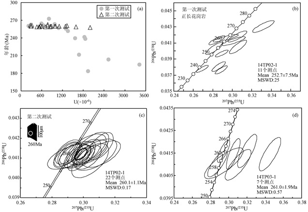 图 3 同普岩基高U锆石两次分析结果 (a)样品14TP02-1两次测试结果的U含量和年龄关系图;(b)样品14TP02-1第一次锆石U-Pb年龄谐和图;(c)样品14TP02-1第二次锆石U-Pb年龄谐和图;(d)样品14TP03-1第二次锆石U-Pb年龄谐和图 Fig. 3 Comparison of two results of high-U zircon and results of zircon U-Pb data of Tongpu batholith (a) U vs. age diagram of two-round running; (b) concordia diagram of zircons from sample 14TP02-1 during the first running; (c) concordia diagram of zircons from sample 14TP02-1 during the second running; (d) concordia diagram of zircons from sample 14TP03-1 during the second running |