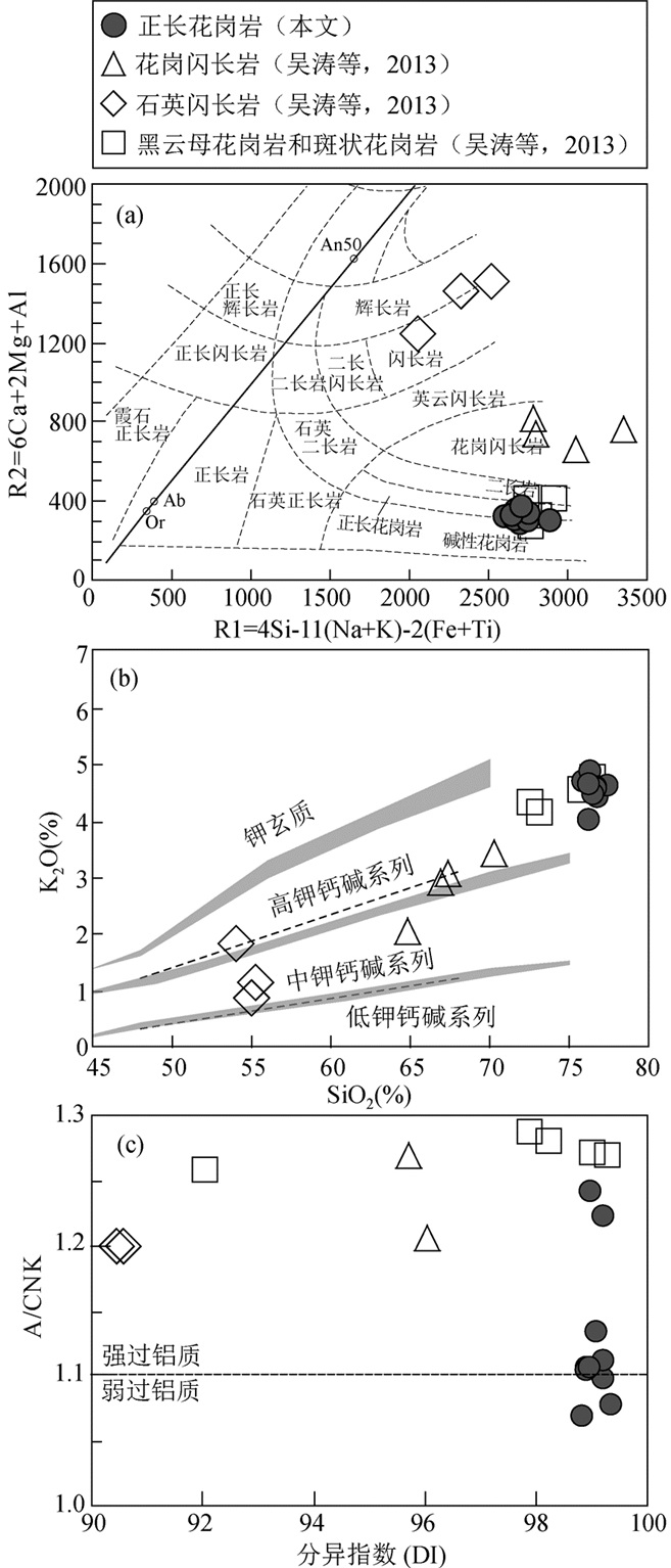 图 4 同普岩基样品的地球化学图解 (a)R1-R2分类图解(De la Roche et al., 1980);(b)SiO2-K2O图解(Rickwood, 1989);(c)分异指数(DI)-A/CNK图解;花岗闪长岩样品、石英闪长岩样品、黑云母花岗岩和斑状花岗岩样品均引自(吴涛等,2013) Fig. 4 Geochemical diagram of samples from the Tongpu batholith (a) R2 vs. R1 diagram (De la Roche et al., 1980) for classification; (b) K2O vs. SiO2 (Rickwood, 1989); (c) A/CNK vs. differentiation index (DI) plots showing sample compositional variation. A/CNK = Al2O3/(CaO+Na2O+K2O) (molar ratio), DI = Quartz (Qtz)+Orthoclase (Or)+Albite (Ab)+Nepheline (Ne)+Leucite (Lc)+K-feldspar (Kfs), from CIPW calculating values; Data sources: granodiorite, quartz diorite, biotite granite, and porphyritic granite (Wu et al., 2013) |