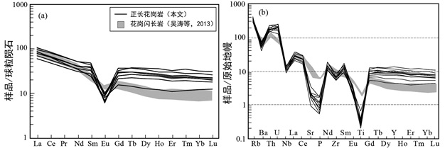 图 5 同普岩基样品的球粒陨石标准化稀土元素配分模式图(a)和原始地幔标准化微量元素配分图(b)(标准化值据Sun and McDonough, 1989) Fig. 5 Chondrite-normalized REE pattern (a) and primitive mantle-normalized trace-element spidergram (b) of samples from the Tongpu batholith (normalization values after Sun and McDonough, 1989) |