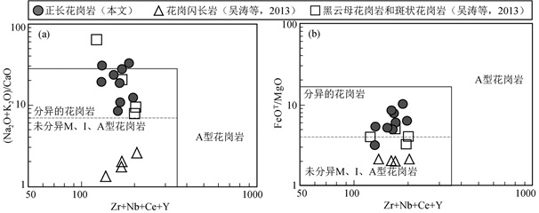 图 6 同普岩基样品的Zr+Nb+Ce+Y-(Na2O+K2O)/CaO (a)和Zr+Nb+Ce+Y-FeOT/MgO (b)(据Whalen et al., 1987) 花岗闪长岩样品、黑云母花岗岩和斑状花岗岩样品均引自(吴涛等,2013) Fig. 6 Zr+Nb+Ce+Y vs. (Na2O+K2O)/CaO (a) and Zr+Nb+Ce+Y vs. FeOT/MgO (b) plots of samples from the Tongpu batholith(after Whalen et al., 1987) Data sources: granodiorite, biotite granite and porphyritic granite (Wu et al., 2013) |