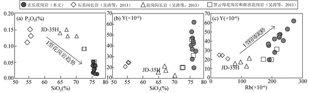 由于高分异花岗岩的矿物组成和化学成分都趋近于低共结的花岗岩,从而为鉴定其成因类型(如I型、A型、S型或M型花岗岩)带来了困难(吴福元等,2007a)。已有研究表明,可采用两种方法鉴别高分异花岗岩的成因类型(I型或S型花岗岩),一是寻找与高分异花岗岩相关的偏镁铁质岩石,因为它们较多地保留了母岩浆的矿物学和地球化学特征(吴福元等,2007b;Wu et al., 2017),钙碱性原始玄武质岩浆在温度较低时,通过角闪石、斜长石和Fe-Ti氧化物在跨度达280℃温度范围内的连续分离结晶,可导致熔体SiO2从53%连续上升到78%(Nandedkar et al., 2014);二是利用一些元素地球化学散点图(如SiO2与P2O5、La、Y和Rb-Th、Rb-Y等),这是因为在准铝质和过铝质岩浆中,这些元素具有不同的地球化学行为(Chappell, 1999; 李献华等, 2007)。本文样品与文献报道的同普岩基花岗闪长岩、黑云母花岗岩和斑状花岗岩一起,在SiO2-P2O5散点图上,共同定义了良好的与I型花岗岩特征类似的负相关趋势(图 7a)。对I型花岗岩而言,随着SiO2的增高,Y作为强不相容元素,其含量将急剧升高,在SiO2-Y图解上形成明显的“翘尾”现象(Chappell, 1999),这一特征与同普岩基中SiO2 > 65%样品所定义的趋势相符(图 7b)。同普岩基富硅花岗岩所定义的I型花岗岩趋势,在Rb-Y图解上也得到了很好体现(图 7c)。因为富Y矿物不会在准铝质I型岩浆演化的早期阶段结晶,从而引起分异的I型花岗岩的Y含量高,并与Rb含量呈正相关关系(李献华等,2007;朱弟成等,2009)。因此,同普岩基边缘相的高硅花岗岩样品,很可能来源于I型花岗质母岩浆的结晶分异,属于高分异I型花岗岩。