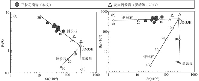 一般认为,I型花岗岩主要来源于壳内变质中基性火成岩的部分熔融(Roberts et al., 1993;程顺波等,2016)。本文同普岩基边缘相高分异花岗岩负的锆石εHf(t)(-9.9~-5.8) 和古老的地壳模式年龄(1.8~2.0Ga),与同普岩基斑状花岗岩和花岗闪长岩的全岩εNd(t)(-10.3~-8.6) 和二阶段地壳模式年龄(1.6~1.5Ga)(吴涛等,2013)接近,表明这些高分异花岗岩的母岩浆主要来源于古老下地壳的部分熔融。由于这些富硅花岗岩具有与同普岩基中石英闪长岩(εNd(t)=1.37) 不同的同位素组成,表明它们不太可能由闪长质岩石分离结晶而来。考虑到这些边缘相的高分异岩石具有与同普花岗闪长岩类似的同位素组成,指示可能来自共同源区,因此如果假定花岗闪长岩中分异程度最低的样品(JD-35H)可用来代表本文样品的母岩浆,那么定量模拟表明,这些高分异岩石的Ba/Sr比值和Ba、Sr丰度,可由母岩浆经历10%~15%斜长石分离结晶作用来解释(图 8a, b)。由于Sr、Eu对斜长石是相容元素,Nb、Ta和Ti在富钛矿物相(如钛铁矿和/或金红石)中是相容元素,P在磷灰石中是相容元素,因此同普岩基中高硅花岗岩强烈亏损Sr、Eu、Nb、P和Ti等特征(图 5)指示了这些矿物相的分离。