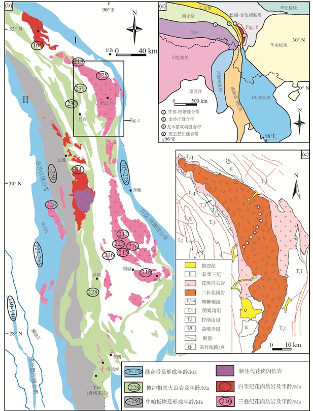 1 地质背景义敦岛弧带是“三江”多岛弧盆体系中最大的岛弧带,位于甘孜-理塘缝合带的西侧,是晚三叠纪甘孜-理塘洋向西俯冲于中咱板块下而形成的陆缘火山弧(图 1a)。由于甘孜-理塘洋的裂开使得自奥陶纪至晚二叠纪一直接受稳定地台型沉积的中咱微陆块与扬子地台西南缘分裂开来,形成单独陆块(侯增谦等, 1995)。由于构造环境、应力场状态、矿床产出类型等存在较大差异,义敦岛弧带可以分为北部的昌台弧和南部的中甸弧。昌台弧在张性应力下发育了弧间裂谷和弧后盆地,中甸弧为挤压应力下不发育弧盆体系(图 1b)(刘学龙等, 2015; 刘树文等, 2006a, b)。义敦岛弧发育了一系列NW向断裂带,在北部断裂带与甘孜-理塘构造带基本平行,控制了雀儿山、措交玛和稻城等岩体的产出分布特征(图 1b)。义敦岛弧主要发育印支期(215~230Ma)俯冲相关的岩浆作用和燕山期(77~105Ma)陆内挤压造山相关的岩浆作用(Wang et al., 2016),前者岩浆活动以火山喷发为主,同时伴有侵入活动,岩性从基性到酸性都有分布,后者以侵入活动为主,岩性主要为酸性花岗岩组合(侯增谦等, 2004; 马比阿伟等, 2015)。