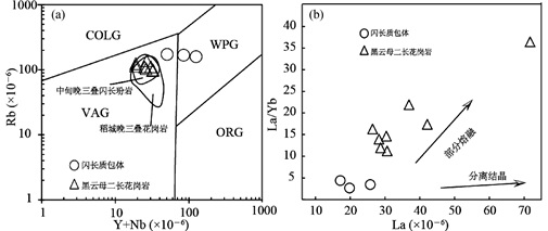 图 10 措交玛岩基花岗岩构造判别图(a)和形成机制判别图(b)(据Wang et al., 2017) Fig. 10 Discriminant diagrams of settings (a) and mechanisms (b) for the Cuojiaoma batholith (after Wang et al., 2017) |