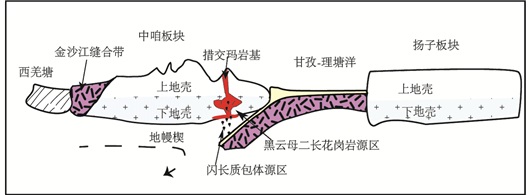 (3) 甘孜-理塘洋向西的俯冲导致了洋壳的部分熔融,形成闪长质熔浆。闪长质熔浆的上涌导致下地壳部分熔融形成二长花岗质岩浆,两种岩浆混合形成措交玛岩基。