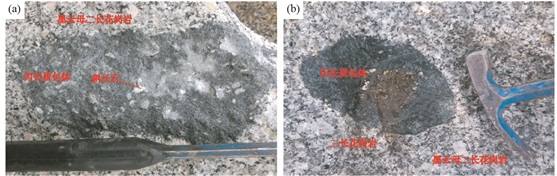 图 2 措交玛岩基中镁铁质包体野外照片 (a)黑云母二长花岗岩中的闪长质包体呈弥散型边界;(b)黑云母二长花岗岩与包体界线截然 Fig. 2 Field photos of MMEs in the Cuojiaoma batholith |