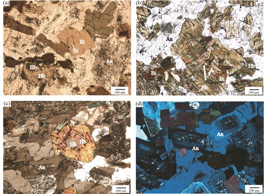 图 3 措交玛岩基岩浆混合作用有关的显微照片 (a-c)寄主岩和包体中矿物间的包含结构(-);(d)寄主岩石中长石斑晶的溶蚀环带(+).Bi-黑云母;Hb-角闪石;An-斜长石 Fig. 3 Microphotographs showing rock textures related to the magma mixing in the Cuojiaoma batholith |