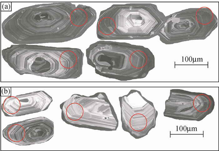 图 4 措交玛岩基黑云母二长花岗岩(a)和镁铁质包体(b)锆石阴极发光照片 Fig. 4 Cathodoluminescence (CL) images of zircons from the biotite quartz monzogranite (a) and the MMEs (b) |