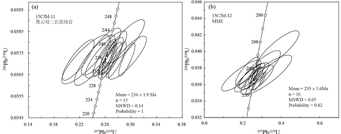 对黑云母二长花岗岩(15CJM-11) 中15个锆石和暗色微粒包体中(15CJM-12)16个锆石U-Pb定年分析(表 1)表明,黑云母二长花岗岩锆石Th含量为179×10-6~854×10-6,U含量为205×10-6~1886×10-6,Th/U比值为0.39~0.66,为典型的岩浆锆石Th/U比值(0.31~0.83)(William et al., 1996)。黑云母二长花岗岩锆石LA-ICP-MS U-Pb分析结果具有很好的协和性,协和年龄为236±1.9Ma(MSWD=0.14,n=15)(图 5a)。暗色微粒包体中(MME)锆石Th含量为61×10-6~254×10-6,U含量为116×10-6~432×10-6,Th/U比值为0.40~0.88,为典型岩浆锆石,协和年龄为235±3.6Ma(MSWD=0.65,n=16)(图 5b)。措交玛黑云母二长花岗岩和暗色微粒包体在误差范围内基本一致,是同一时期的产物。