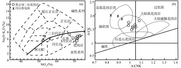 图 6 侵入岩TAS分类图解(a, 据Wilson, 1989)和花岗岩类A/CNK-A/NK图解(b, 据朱弟成等, 2008) Fig. 6 TAS (a, after Wilson, 1989) and A/CNK vs. A/NK (b, after Zhu et al., 2008) classification diagrams for the Cuojiaoma batholith |