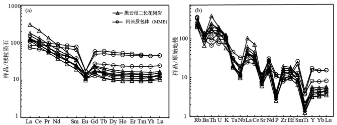 图 7 措交玛黑云母二长花岗岩和闪长质包体稀土元素配分曲线图(a)和微量元素蛛网图(b) Fig. 7 Chondrite-normalized REE patterns (a) and primitive mantle-normalized trace element patterns (b) for the biotite quartz monzonite granite and the MMEs in the Cuojiaoma batholith |