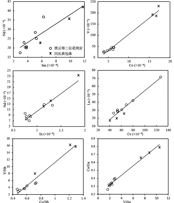 黑云母二长花岗岩稀土含量ΣREE为109.6×10-6~271.0×10-6,轻重稀土分馏明显(LREE/HREE为7.31~19.8),明显Eu负异常(δEu为0.46~0.67)。暗色微粒包体稀土含量ΣREE为115.7×10-6~204.1×10-6,轻重稀土分馏没有寄主岩石黑云母花岗岩明显(LREE/HREE为2.88~3.14),Eu负异常比寄主岩石更为明显(δEu为0.26~0.40)(图 7a),表明闪长质包体在岩浆作用过程中存在明显的斜长石分离结晶作用。在岩浆混合过程中,Eu主要以类质同象赋存在斜长石中,闪长质包体捕获寄主岩中的斜长石斑晶来源使得包体Eu含量较高(表 2、图 7)(曹殿华等, 2009)。在酸性端员的黑云母二长花岗岩具有更高的轻重稀土分异系数,而基性端员的暗色微粒包体轻重稀土分异系数较低,这和采用玄武岩和英安岩岩浆混合作用模型模拟的稀土元素扇形分布形式相似(McMillan and Dungan, 1986; 邹滔等, 2011)。这种在稀土分配图上,寄主岩石具有更陡的稀土配分模式,而包体相对较缓,这可能是因为包体中角闪石和磷灰石含量更高或在酸性岩浆中REE优先分离的缘故(胡芳芳等, 2005)。微量元素而言,黑云母二长花岗岩和暗色闪长质微粒包体整体上具有相似性,都富集Rb、Th和U,亏损Nb、Ta和Ti等高场强元素,具有俯冲带岩浆岩的成分特点(图 7b),也反应了岩浆混合作用中可能存在微量元素交换及均一化(董国臣等, 2006)。和Harker图类似,在微量元素Sm-Nd、Co-V、Nd-Ta等相关图也可以反映岩浆成因(图 8),由于受到固溶体矿物晶出的影响,其演化多为曲线,而不是直线,措交玛岩基寄主岩石和暗色微粒包体岩石投影点均呈一致连续直线分布,表明存在岩浆混合联系(邹滔等, 2011)。