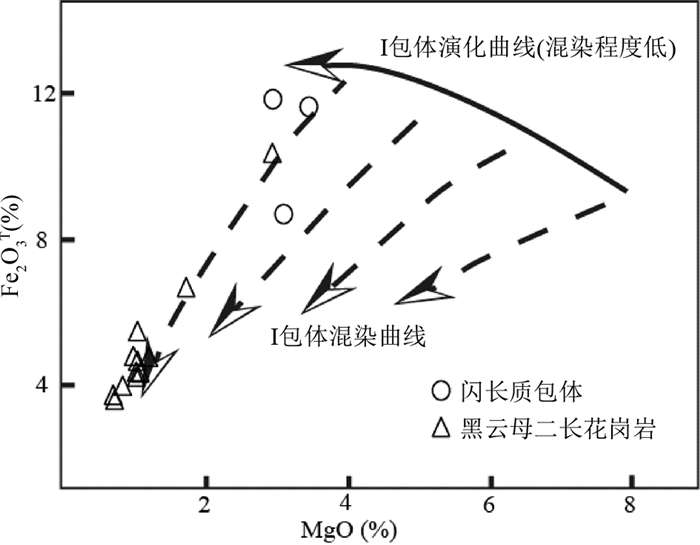 一般认为,Nb和Ta为高场强稳定元素,离子半径相近,地球化学性质相似,可利用Nb/Ta比值来研究岩浆的成因。措交玛岩基中闪长质包体Nb/Ta比值为11.0~12.5,平均值为11.5,寄主岩黑云母二长花岗岩的(Nb/Ta=8.43~12.9,平均值为10.1) 基本一致,都与花岗岩(平均值为12) 差别不大(王晓霞等, 2005)。但是闪长质包体的值明显的低于洋壳熔融玄武质岩石(平均值为17)(邹滔等, 2011),表明措交玛岩基中捕获的闪长质包体可能并不是岩浆混合作用中最终的基性端员。甘孜-理塘洋向西俯冲板块熔融形成的玄武质岩浆才是措交玛岩基混合作用中最基性端员。尽管在岩浆混合作用中,包体和寄主岩石在化学组成上存在明显的差别,但是寄主岩石和包体在Fe2O3T与MgO比值存在明显其别,不同的寄主岩石和包体在MgO-Fe2O3T图中将会沿不同的混染曲线分布(Zorpi et al., 1989)。措交玛岩基闪长质包体和寄主岩石都沿同一混染曲线分布(图 9),但是闪长质包体亦靠近包体演化曲线,表明岩浆的化学混合(mixing)是有限的,更多的表现为机械混合(mingling)。
