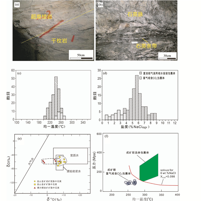 图 13 江西金山金矿矿化、流体显微测温数据、氢氧同位素和成矿压力图解(据Zhao et al., 2013) Fig. 13 The graphs of ultramylonite type orebodies (a) and quartz vein type orebodies (b), salinities and homogenization temperatures of fluid inclusions from ore stage quartz veins (c, d), H-O isotopes of the fluid inclusions hosted in quartz (e) and trapping pressures calculated from fluid inclusions in quartz (f) in the Jinshan deposit (after Zhao et al., 2013) |