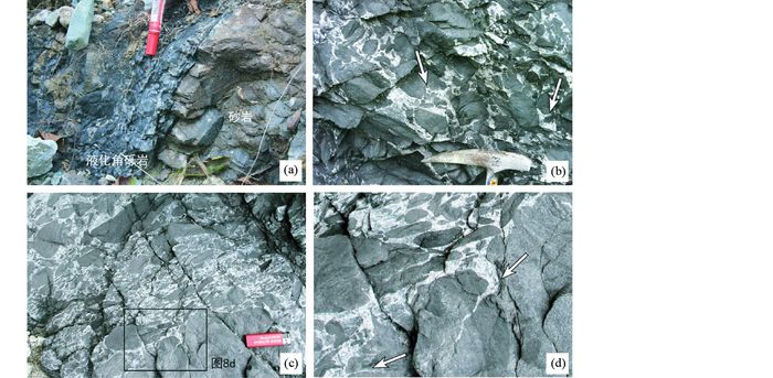 图 8 龙门山虹口地区地表须家河组须二段地层中液化角砾岩特征 (a)液化角砾岩与砂岩互层;(b)液化角砾岩中灰白色细沙呈“基质”充填在“角砾”之间;(c)液化角砾岩呈“碎屑流”特征,其中灰白色细沙呈“流体”状灌入在“角砾”之间;(d)为(c)图中局部放大,可见明显的“细沙脉”.箭头指示“细沙脉” Fig. 8 Characteristics of liquefied breccia from the second section of Xujiahe Formation in Hongkou outcrop, Longmen Shan region |