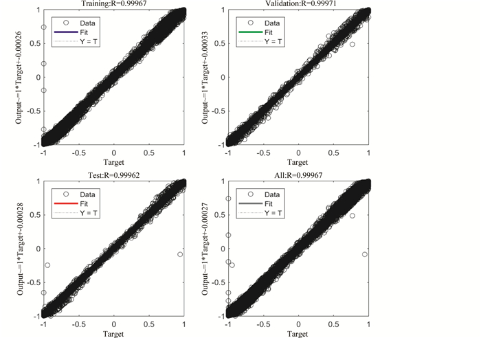 图 7 各数据集拟合误差分布 R表示正确率,Target表示数据标准化后的标签,Output表示神经网络输出 Fig. 7 Fitting error distribution of each data set R refers to the rate of accuracy, Target refers to the labels of the normalized data, Output refers to the results of the neural network |