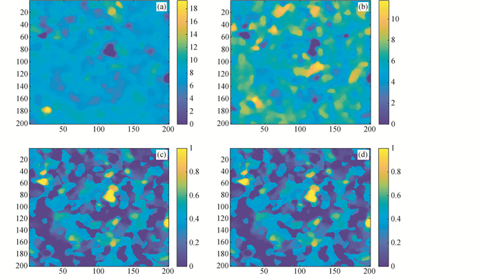 测试实验中仍然采用同一区域的岩石样本在18keV和20keV的X射线下的CT数据(201*201)作为输入。得到的结果如图 8所示,其中图 8a, b分别为在18keV和20keV能量的X射线下,页岩样本同步辐射扫描重构后的图像;图 8c为通过神经网络计算所得的孔隙结构图像;图 8d为标签数据。通过计算,图 8c, d的均方误差在10-4左右,达到了精度要求。