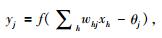其中,f是第j层激活函数,为图 2所示的阶跃函数或者sigmoid函数;whj表示权值,θj表示阈值,yj表示第j层神经元的输出。通常将将权重和阈值统一起来学习,变量统一用w来表示。