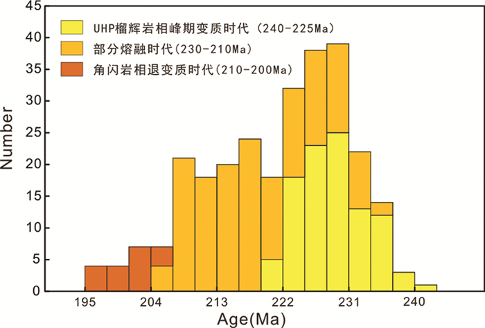 (3) 浅色体锆石边部为深熔作用成因,记录的部分熔融时代为225.9±2Ma,指示部分熔融作用发生在深俯冲陆壳折返早期阶段。