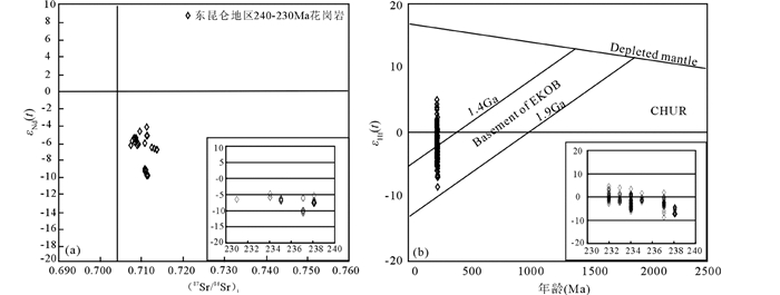 图 8 东昆仑地区240~230Ma花岗岩的(87Sr/86Sr)i-εNd(t)图解(a)和年龄-εHf(t)同位素图解(b) Fig. 8 Diagrams of (87Sr/86Sr)i vs. εNd(t) (a) and Age vs. εHf(t) (b) for 240~230Ma granite in East Kunlun area |
