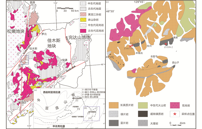 佳木斯地块是中国东北地区的一个重要大地构造单元,位于黑龙江省东部地区。地块西侧为松嫩地块,东面与完达山地体相连,向北延伸至俄罗斯境内的布列亚地块,周边以跃进山断裂,敦化-密山断裂,牡丹江断裂,佳木斯-依兰断裂为界(图 1b)。佳木斯地块主要由麻山杂岩、黑龙江杂岩和古生代花岗岩构成(Wu et al., 2007)。其中麻山杂岩是一套以长英质片麻岩、夕线石榴长英质片麻岩、石墨片岩和大理岩为主的孔兹岩系,并经历~500Ma晚泛非期的高角闪岩相至麻粒岩相变质作用(曹熹等,1992;姜继圣,1992;Wilde et al., 2003)。黑龙江杂岩是一套呈南北带状分布于萝北-嘉荫、依兰-桦南和牡丹江一带的构造混杂岩,主要由蓝片岩、绿片岩、斜长角闪岩、大理岩、超基性岩块、石英岩和云母片岩等组成,经历了蓝片岩相至绿片岩相变质作用(曹熹等,1992;张兴洲,1992;李锦轶等,1999;Wu et al., 2007;颉颃强等,2008;Zhou et al., 2009)。