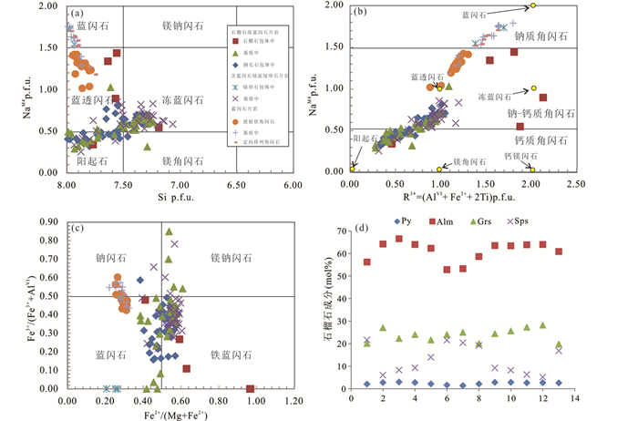 图 3 依兰地区蓝片岩中角闪石成分及分类图解(a-c,据Leake et al., 1997)和石榴石冻蓝闪石片岩中石榴石环带成分(d) Fig. 3 Chemical compositions and classification of amphibole in blueschists (a-c, after Leake et al., 1997) and garnet zoning of the garnet-barroisite schist (d) from the Yilan area |