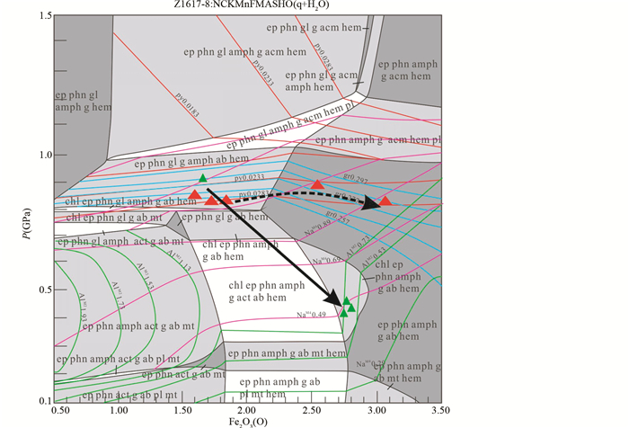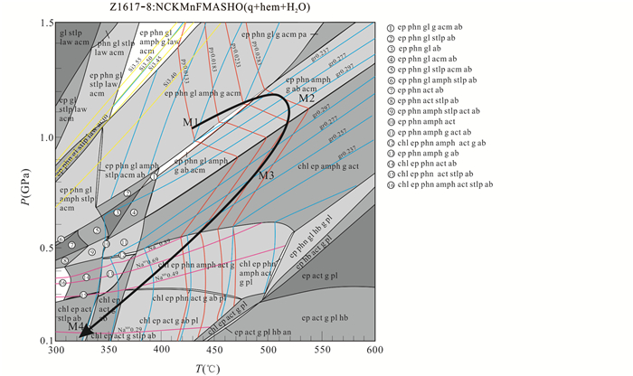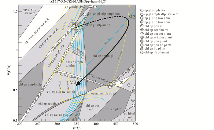图 6为样品Z1617-5在NCKFMASHO体系下P-T视剖面图。根据镜下观察到的矿物组合特征及矿物成分特征,可以识别出三个演化阶段:进变质阶段(M1)矿物组合以绿帘石内包体矿物和绿帘石核部成分为代表gl+amph+ep,由视剖面图中可以观察到此矿物组合的稳定温压范围为345~362℃、1.2~1.36GPa,推测此时变质级别达到了硬柱石蓝片岩相,但镜下并没有观察到硬柱石的出现,可能是由于硬柱石的保存需要大量的水,在进变质阶段升温过程中,硬柱石脱水转变成绿帘石(Clarke et al., 2006;Wei and Clarke, 2011);在蓝色角闪石中,Fe2+和Mg的比值反映原始片岩的变质等级(Brown, 1974),由实测的角闪石中NaM4含量和Fe2+/(Fe2++Mg)比值的交点可以估算出,峰期(M2)温压条件为480℃、1.4GPa,矿物组合为chl+ep+gl+amph,变质级别达到绿帘蓝闪片岩相;退变质阶段(M3)矿物组合以绿帘石边部成分和基质矿物为代表amph+ep+chl+act+stlp,此时稳定的温压范围为<370℃和<0.7GPa。退变质阶段NaM4含量和Fe2+/(Fe2++Mg)比值的交点指示温压为340~350℃、0.5~0.6GPa, 为绿片岩相。